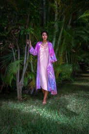 Envision your dreams through the ether, floating amongst the northern lights. You'll be transported into color particles of blue violet, shades of green, and a halo of powder pink depending on the altitude. Hand Dyed 22 momme Mulberry Silk Robe.